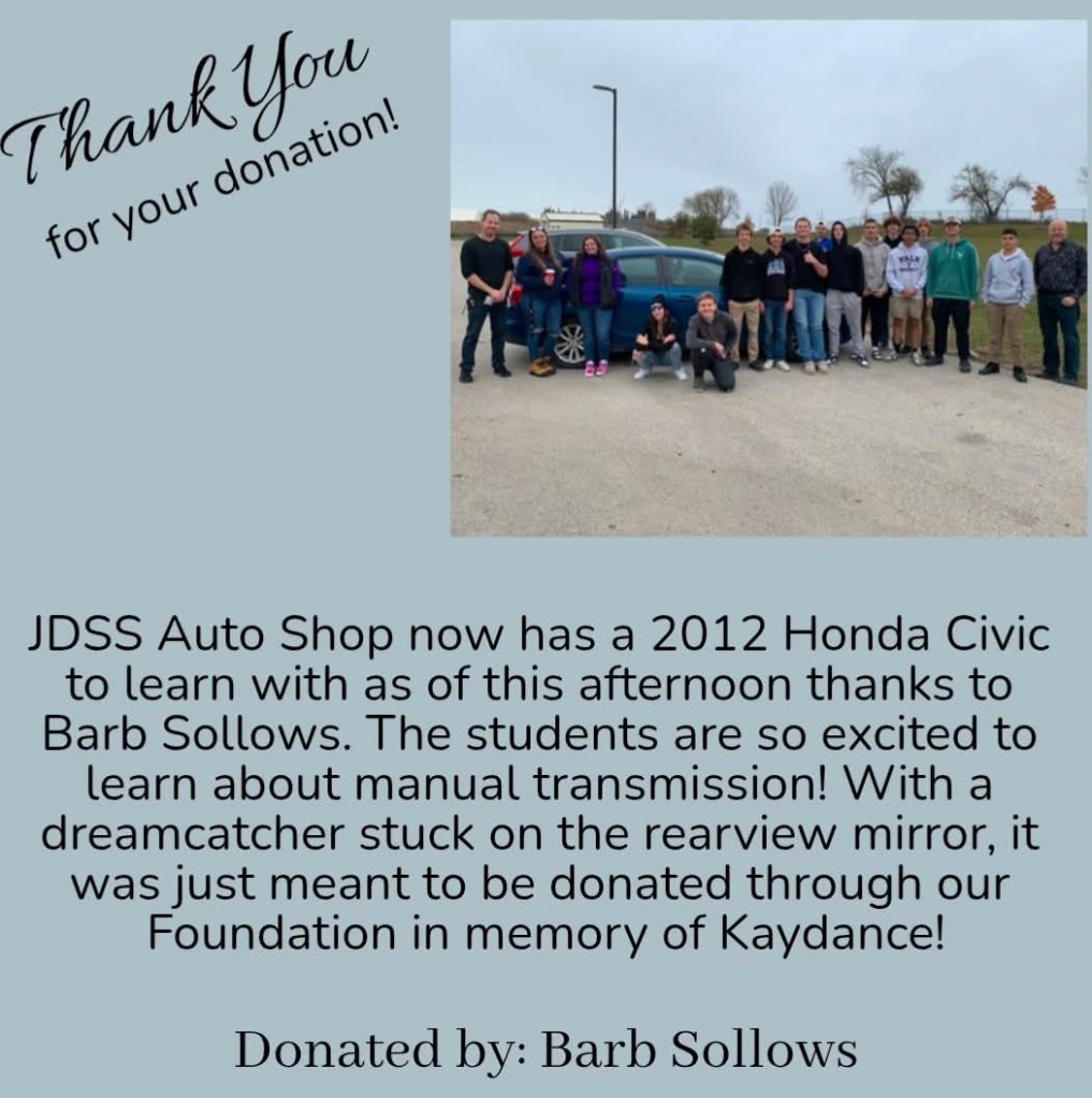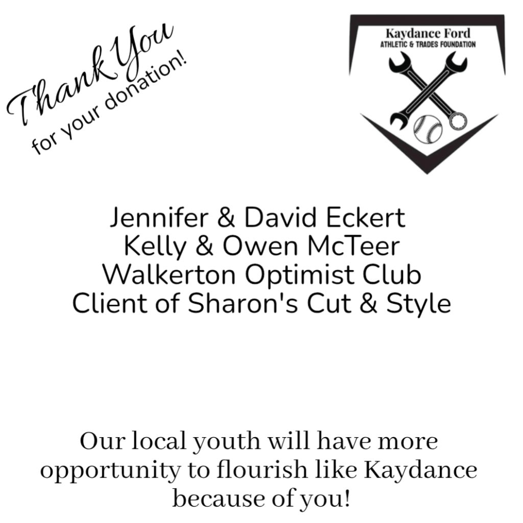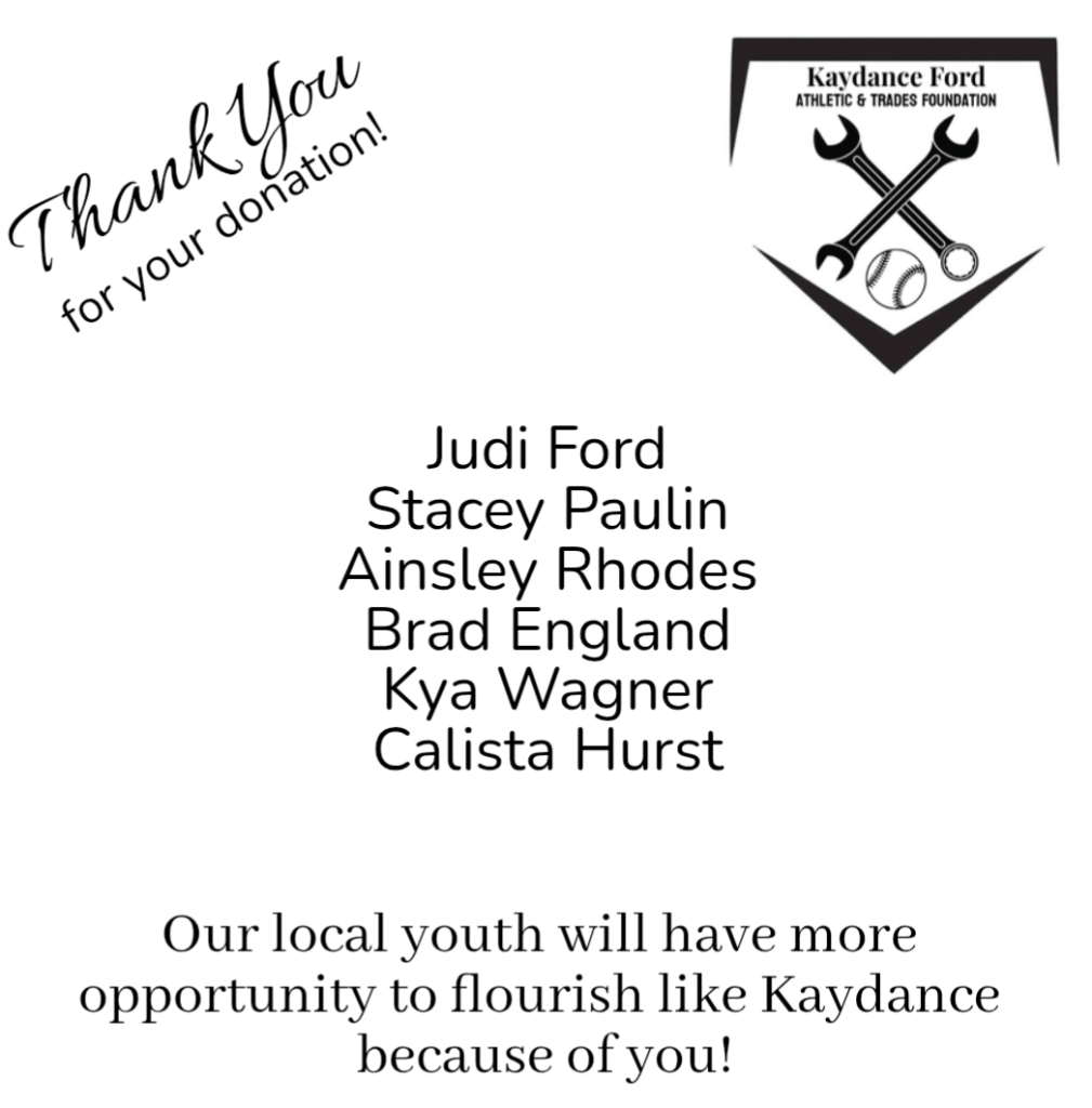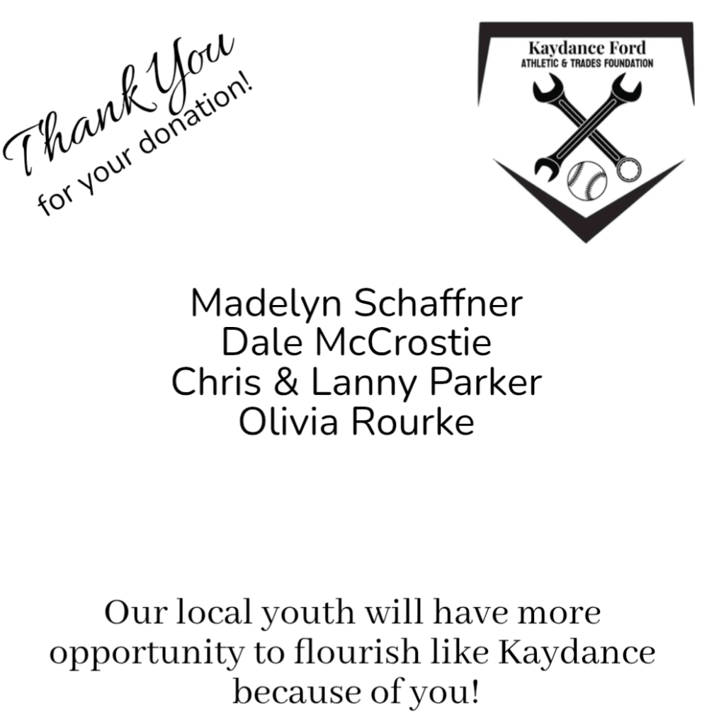 Thank you so much to our local businesses, organizations, individuals, and corporations who have supported us through donations! Because of people like you, we are able to help our local youth flourish through Athletics and Trades, just like our daughter Kaydance did.