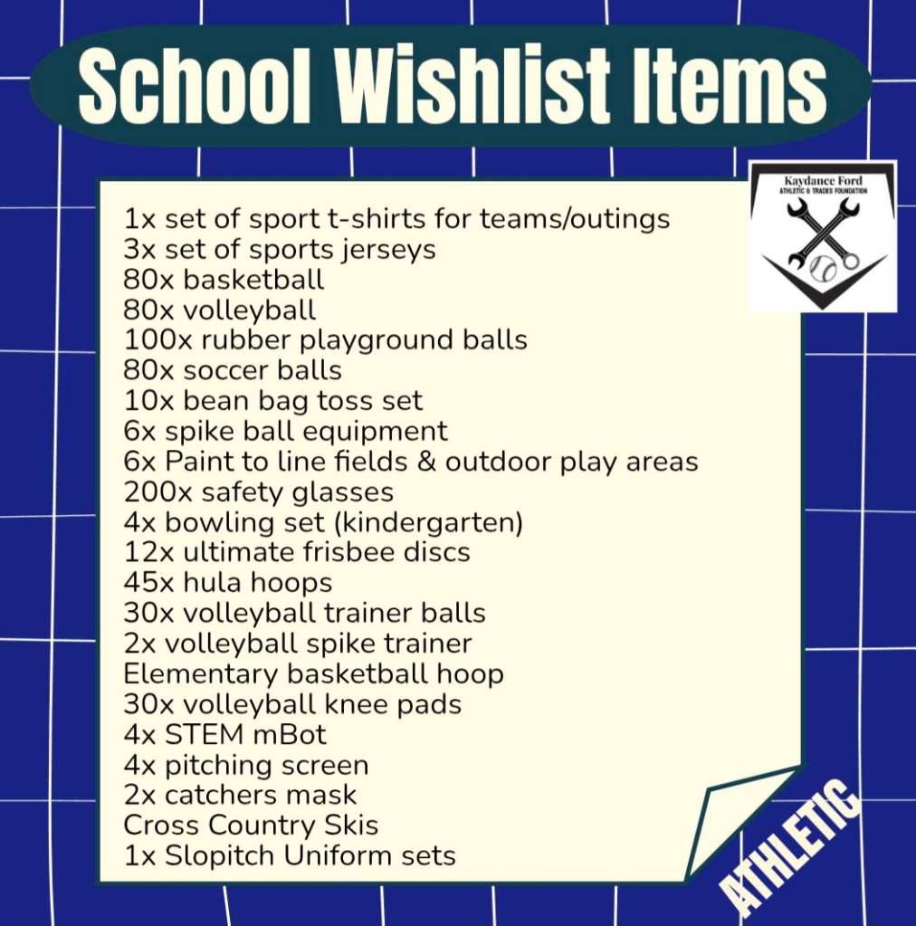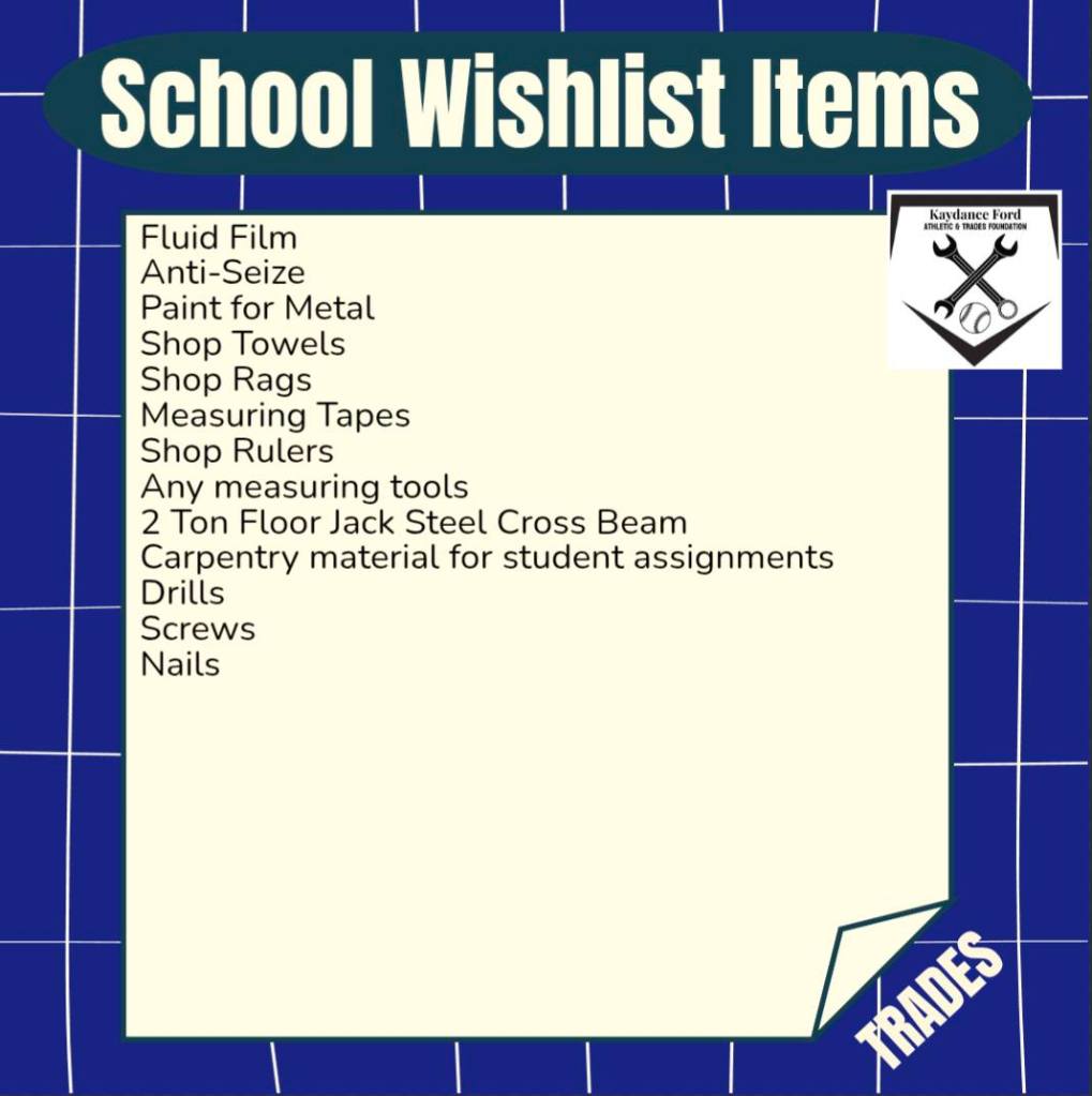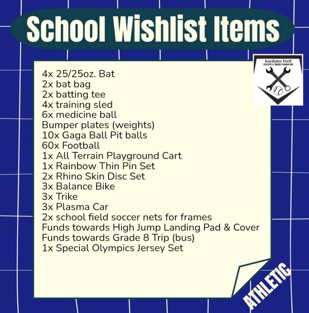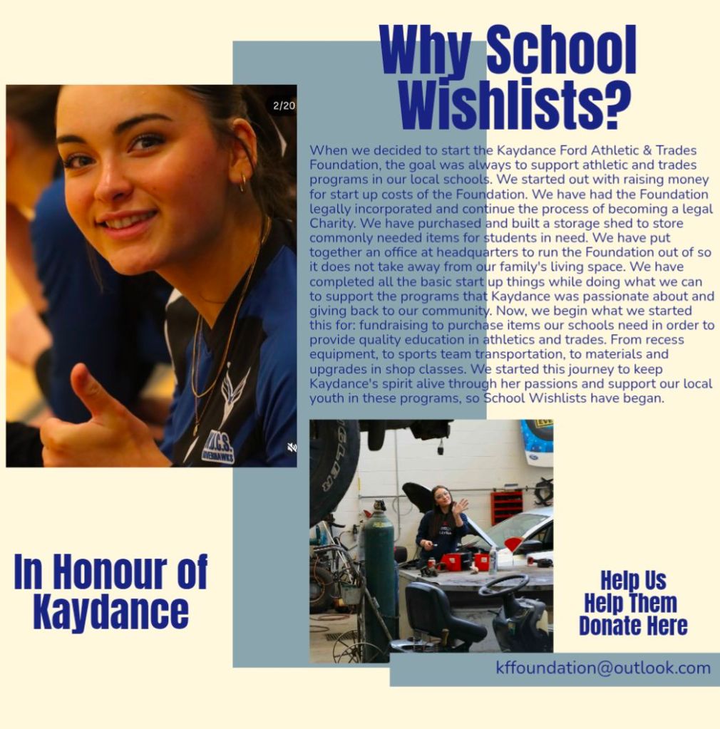 In early 2026, we had finally finished our start up and were able to begin what we created our Foundation for: putting needed items into our local schools, helping to boost student and staff mental wellbeing! While we had donations of vehicles and used items in the beginning, our School Wishlist Program was what we had planned to do all along. We are so excited to officially have this started! Whether it’s a team set of jerseys, some playground balls for recess, some shop rags, or a saw for the shop: we are finally setting out to help our local schools get what they need to offer quality education in Athletics and Trades to our local students! Kaydance was passionate about these programs and often spoke about different things they needed just in her school, we know there are many other schools in need of items too! Kaydance also had many conversations about how these needed items directly impacted the mental health of staff of students. They see what big city schools get, what they get to do and learn – what about our rural schools?! Our local youth and staff have been suffering from lack of funding and lack of support which means their mental health has been on a decline for years. So in honour of Kaydance and her passion for athletics and trades, and wanting to give her classmates and teachers a boost in mental health and wellbeing, we have officially began our School Wishlist Program!