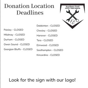 Donation Locations: Hanover, Elmwood, Chesley, Paisley, Southampton (we are currently looking for Donation Locations in Tara, Owen Sound, Kincardine, Port Elgin, and Walkerton. If you are interested in being a Donation Location, please email us.)