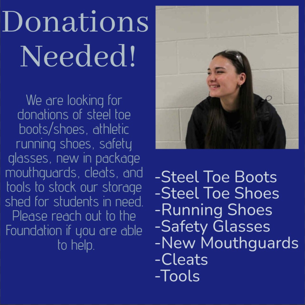 We are always in contact with our local schools and have them prepare lists of items they currently need for their Athletic and Trades classes. If there is something on the list that you or your business can donate, connect with us so we can set up delivery.