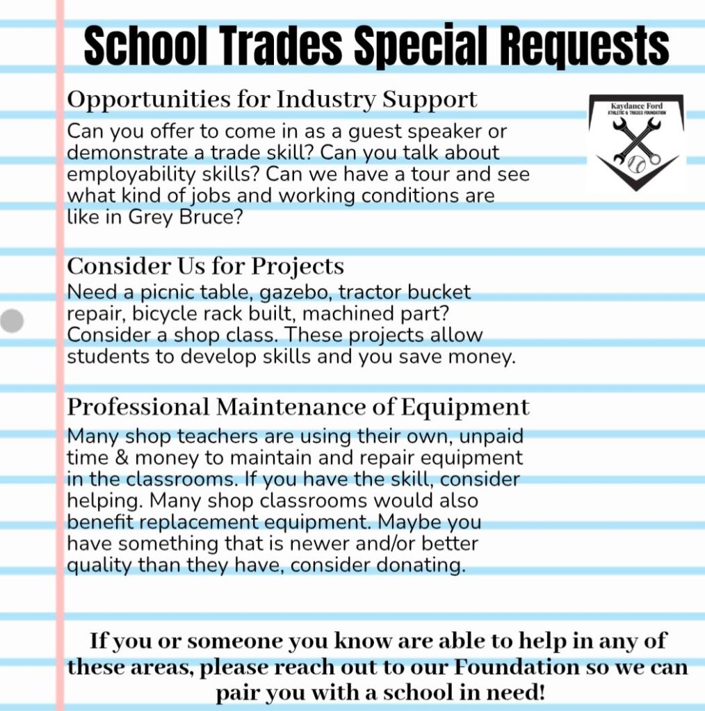 We are always looking for items for our storage shed at Foundation Headquarters. This shed is used to house items for students in need. When a school or student reaches out to us, we either gather the items they need or invite them to shop in the shed. We also collect wishlists from our local schools within Bluewater District School Board and Bruce Grey Catholic School Board of items they currently need for their Athletic and Trades classes. If there is something on the lists below that you or your business can donate (or funds for these items), connect with us so we can set up delivery.
